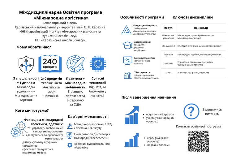 Освітньо-професійна програма «Міжнародна логістика» має міждисциплінарний характер і ґрунтується на поєднанні міжнародних відносин, менеджменту та торгівлі. Її мета – підготувати фахівців, здатних управляти логістичними процесами в умовах глобальної конкуренції, дотримуючись норм міжнародного права, адаптуючись до динаміки зовнішнього середовища та впроваджуючи ефективні логістичні рішення.