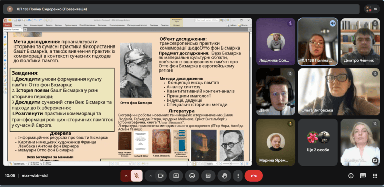 - Поліна Сидоренко (Харківський ліцей №138) – «Вежі пам’яті: історико-культурний вимір спадщини Отто фон Бісмарка у транс’європейській політиці пам’яті»