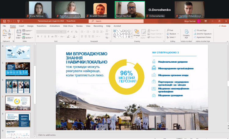 Гості поділилися власним досвідом участі в міжнародних миротворчих операціях та представили напрями діяльності громадської організації «Об’єднання миротворців ООН». Борис Ящук, який був учасником миротворчих місій ООН у складі контингентів KFOR, UNMIK, UNMIS та UNMISS (досвід роботи в Афганістані,Бангладеш, Лівії, Судані, Південному Судані, Чаді, Тунісі, Косово, Секторі Газа), окреслив ключові навички, необхідні для ефективної діяльності миротворців: комунікаційні здібності, витримку та розуміння місцевого соціокультурного контексту.