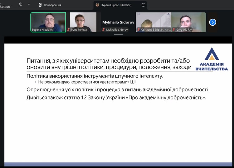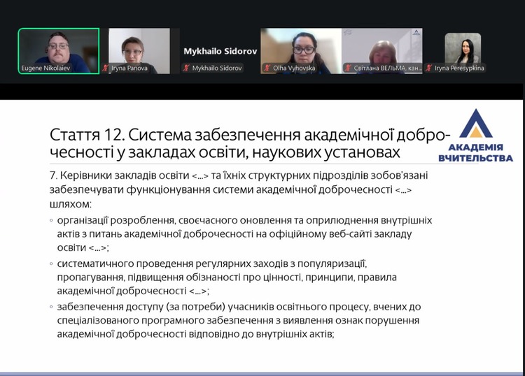 Під час зустрічі учасники мали можливість поставити запитання та долучитися до обговорення актуальних положень Закону України «Про академічну доброчесність», зокрема його практичного значення для організації освітнього процесу, функціонування закладів освіти та дотримання принципів академічної доброчесності всіма учасниками освітнього середовища.
